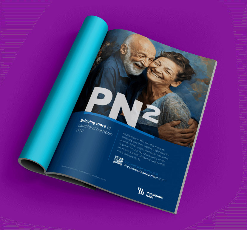 Keeping patients and caregivers front and center, we breathed life and dimension into journal ads with creative use of art elements and dramatic expressions of joy. Our headline is an ownable and striking “PN.” The superscript number indicates that Fresenius Kabi is powering up parenteral nutrition, whether it be with their one-of-a-kind 4-oil blend (PN⁴), their omega-3-rich solution (PN³), or their full portfolio of products that offers more options (PN²).