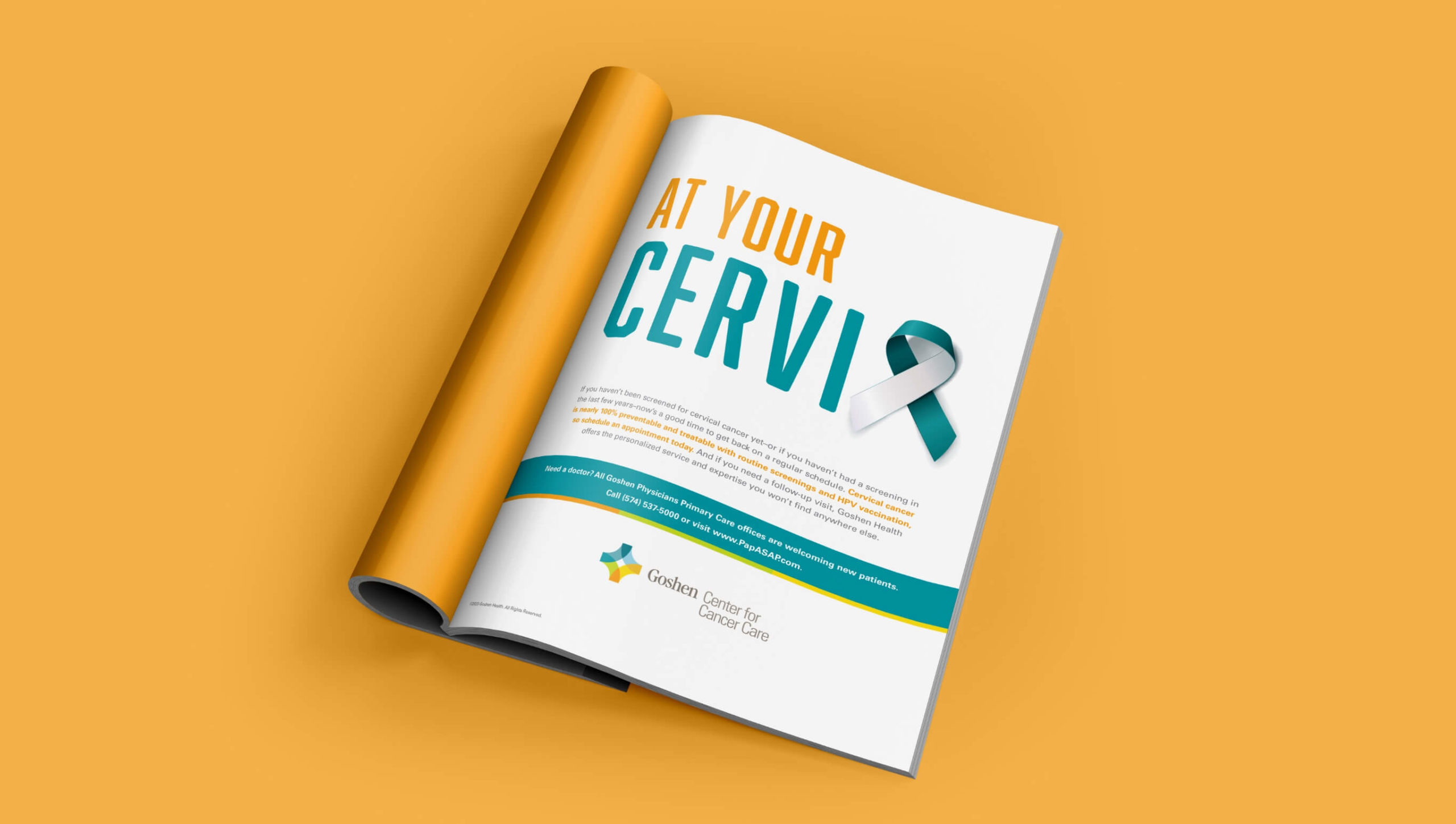 A journal ad pairs the recognizable white and teal ribbon signifying